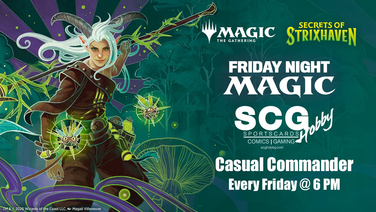Come join us in playing some casual commander in our expanded play area! Build your deck, choose your hero, and be sure to have fun! No registration or entry fee necessary. Simply grab your friends and play some games with cards throughout Magic’s history! Space is only limited by the chairs and tables available. Be sure to keep and eye on our Facebook, Instagram, and X accounts for any updates or special events! #SCGCOMMANDER